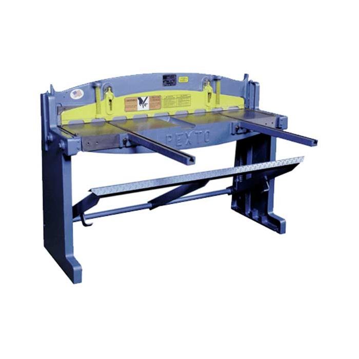 PEXTO foot squaring shears are the industry’s most accurate. They are easy to operate and offer precise shearing, long life and dependability. Shatter-proof transparent finger guards are among their safety features. All are provided with precise gauging and hold-downs for cutting accuracy. Maximum rated capacity is 16 gauge mild steel. No. 152 shears offer triple-action shearing which includes relief on both edges of both the fixed and moving blades. It eliminates blade-to-blade friction, provides “bite” to eliminate sheet movement under shearing stress and produces double penetration in the cutting action. This contributes to easier operation. The No. 152 will handle a 52″ sheet.